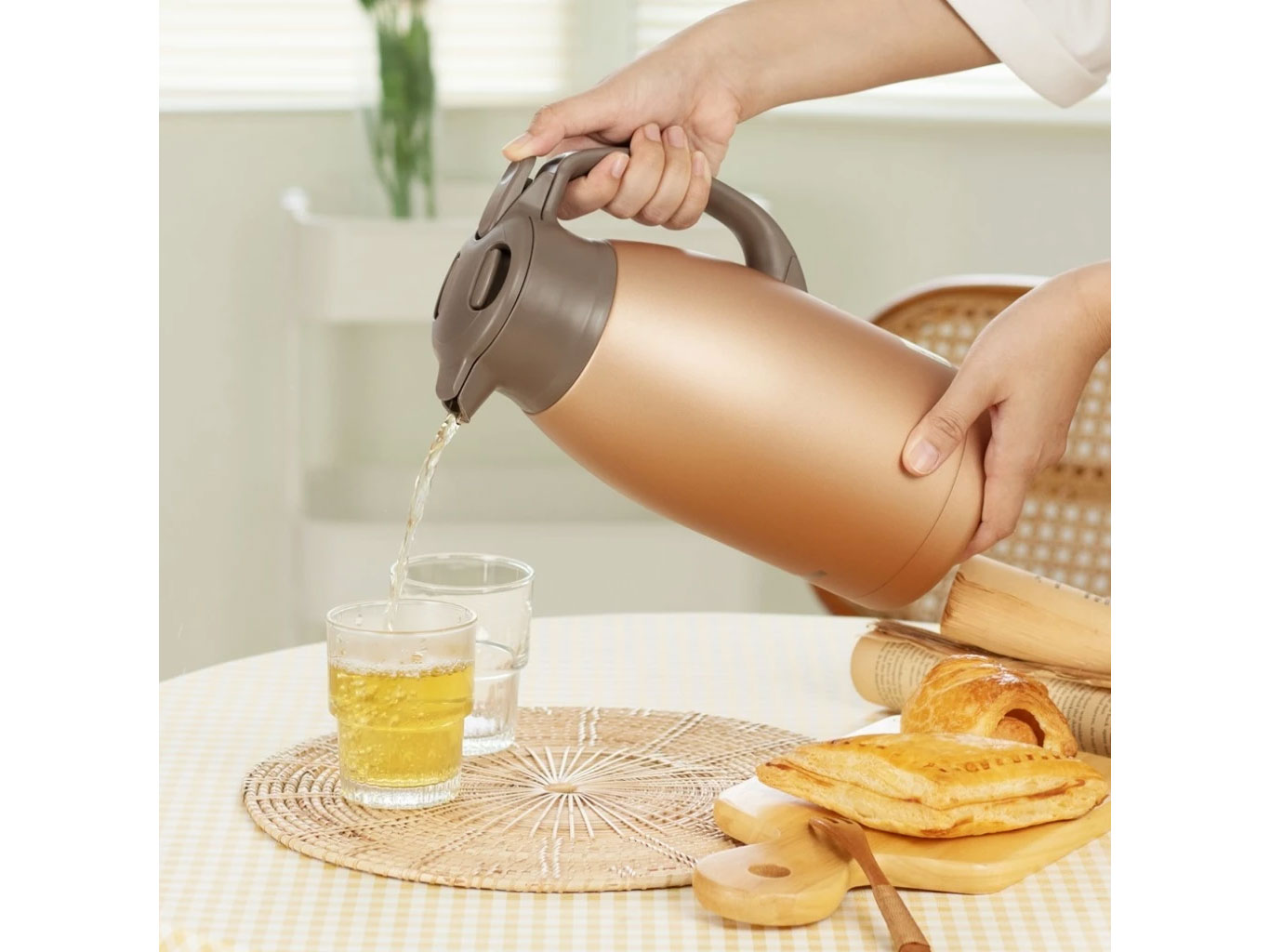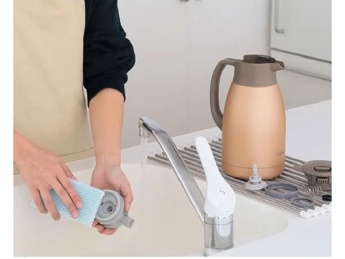 Bình sử dụng nút bấm ngay trên tay cầm, cho phép rót nước dễ dàng mà không cần mở nắp. Thiết kế này: